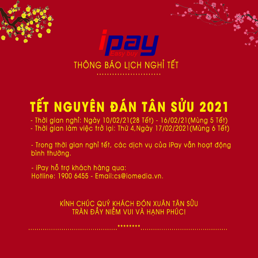 - Lời đầu tiên, iPay trân trọng gửi lời cảm ơn đến Quý khách hàng đã tin tưởng sử dụng các dịch vụ của iPay trong thời gian qua. iPay xin gửi lịch nghỉ Tết Nguyên Đán Tân Sửu 2021 như sau: